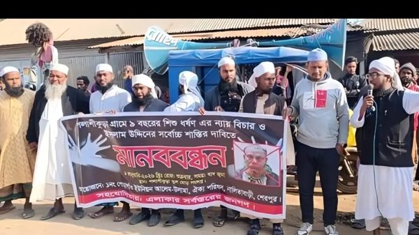 নিজস্ব প্রতিবেদক: শেরপুরের নালিতাবাড়ীতে দরিদ্র এক বাবার ৯ বছর বয়সী চতুর্থ শ্রেণীর শিশু কন্যাকে ধর্ষনের অপরাধে কারাগারে থাকা চিহৃত ধর্ষক ইসলাম উদ্দিনের ফাঁসির দাবিতে ঘন্টাব্যাপী মানববন্ধন করেছেন এলাকাবাসী। শুক্রবার জুমা